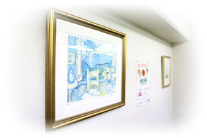 明るいガラス張りの待合室では、観葉植物や絵画もご用意して